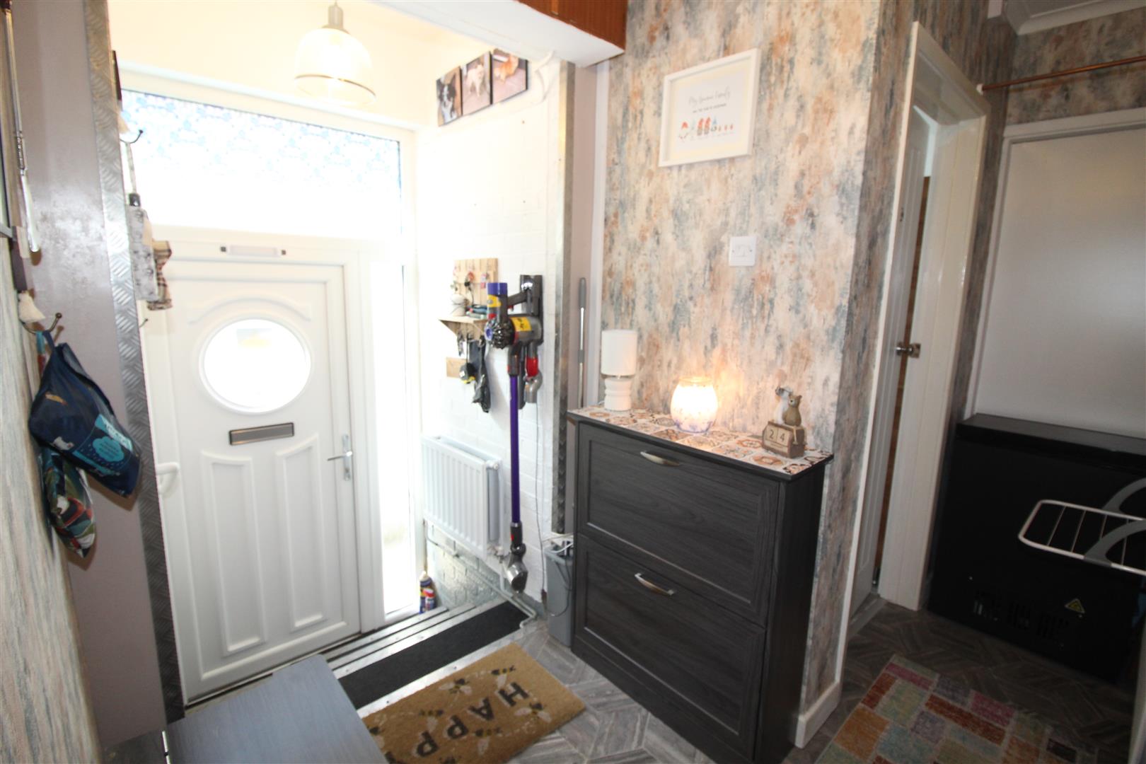 Double glazed entrance door, stairs leading to hallway, coved and papered finish to walls and ceiling, loft access hatch, radiator.