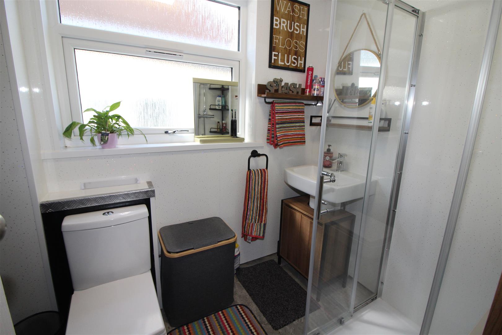 Double glazed window to side aspect, upvc cladding to ceiling, low level WC, wash hand basin, shower enclosure with dual shower heads.