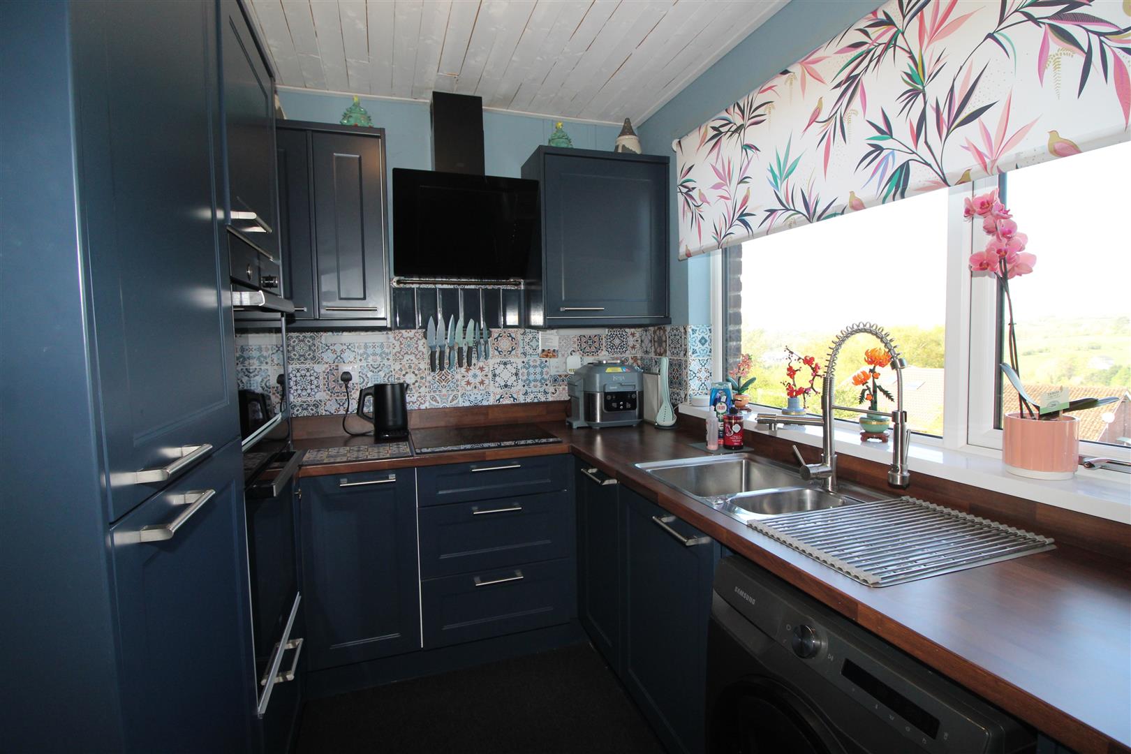 Double glazed window to rear aspect with lovely views, base and wall cabinets, tiled and painted finish to walls, bowl and a half stainless steel single drainer sink, eye level microwave and oven, electric hob, extractor hood, space for fridge/freezer, plumbing for automatic washing machine.