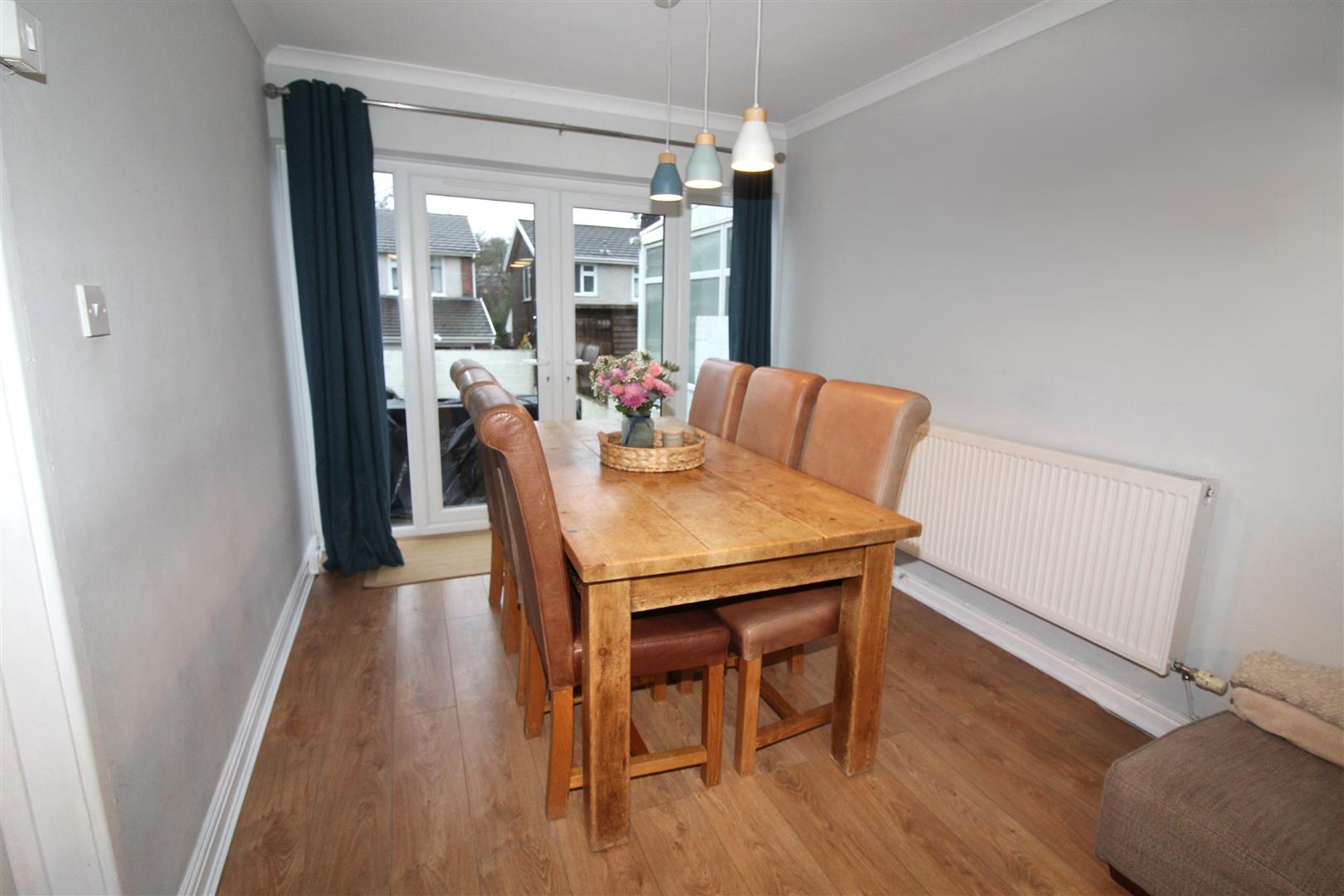 Coved and painted finish to walls and ceiling, laminated wood flooring, radiator, French doors leading to rear garden.