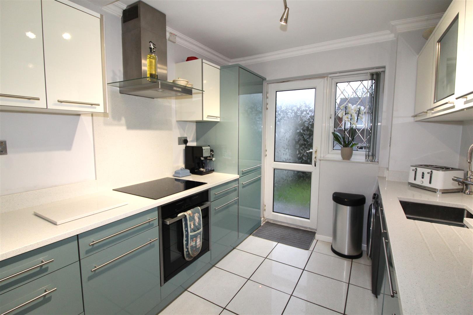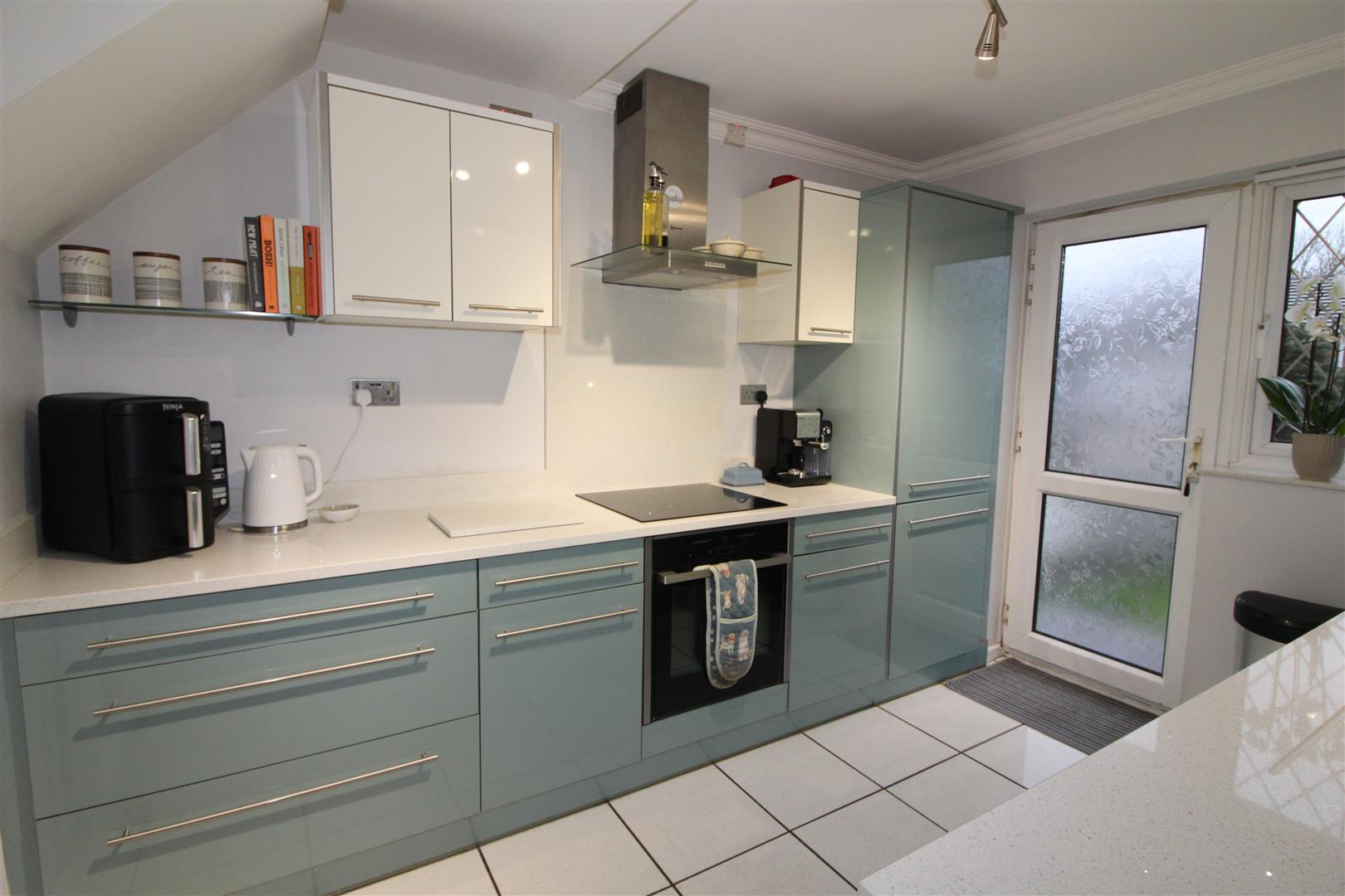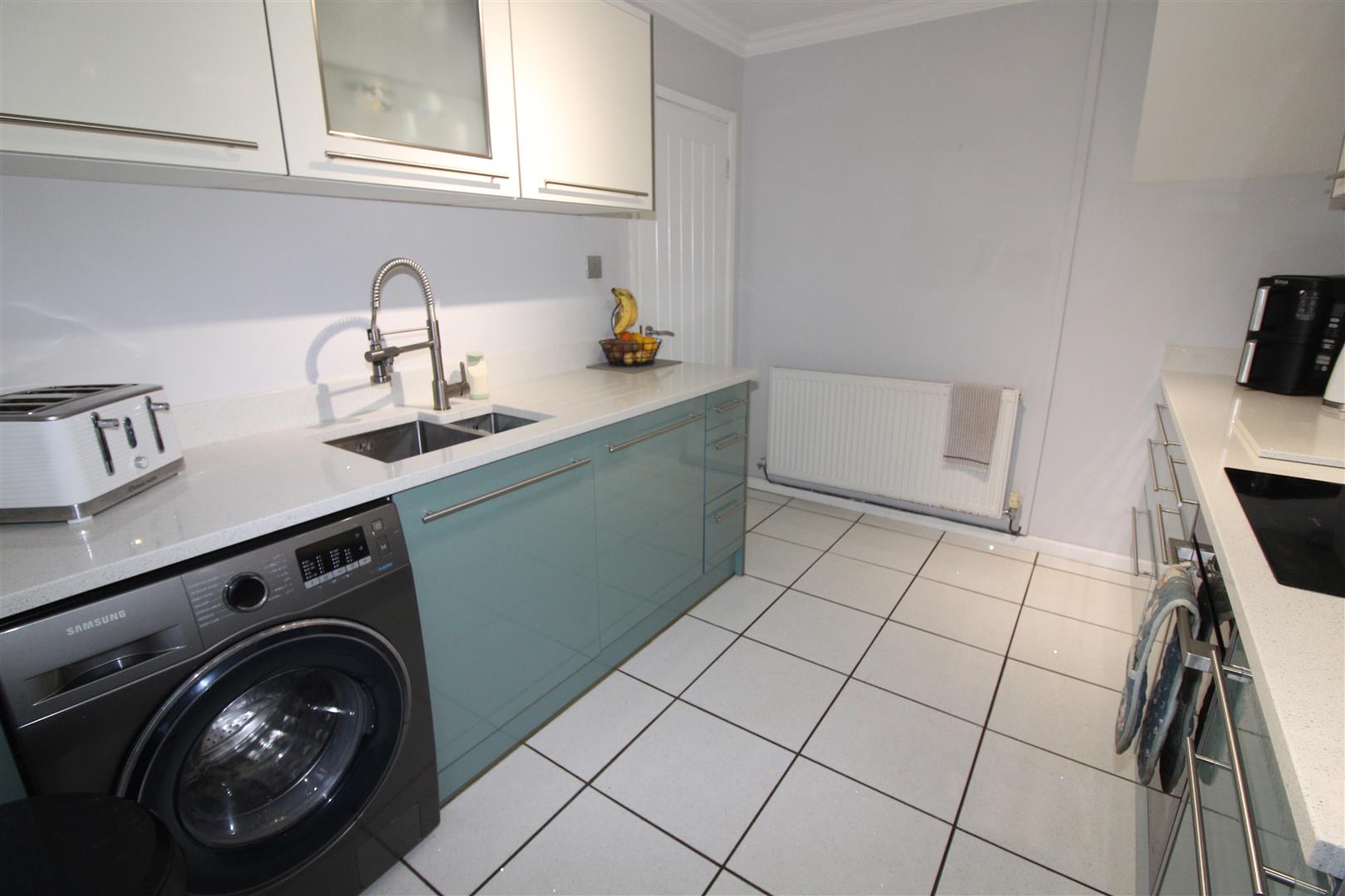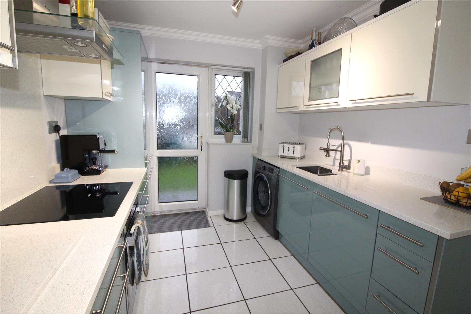 Double glazed window to rear aspect, a fantastic modern kitchen with modern base and wall units, quartz work surfaces incorporating bowl and a half single drainer sink, induction hob, electric oven, extractor hood, built in fridge/freezer and dish washer, tiled flooring, radiator, double glazed door leading to rear garden.