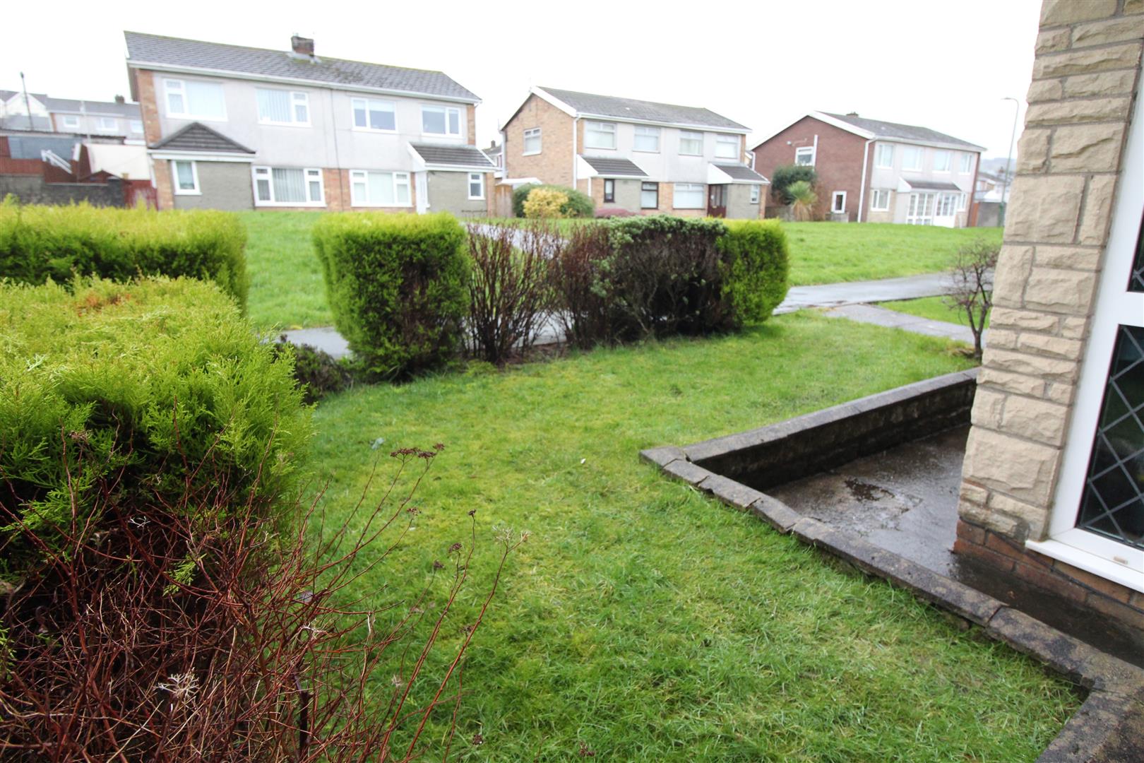 An open plan lawn with mature shrubs, gated pathway leading to rear garden.